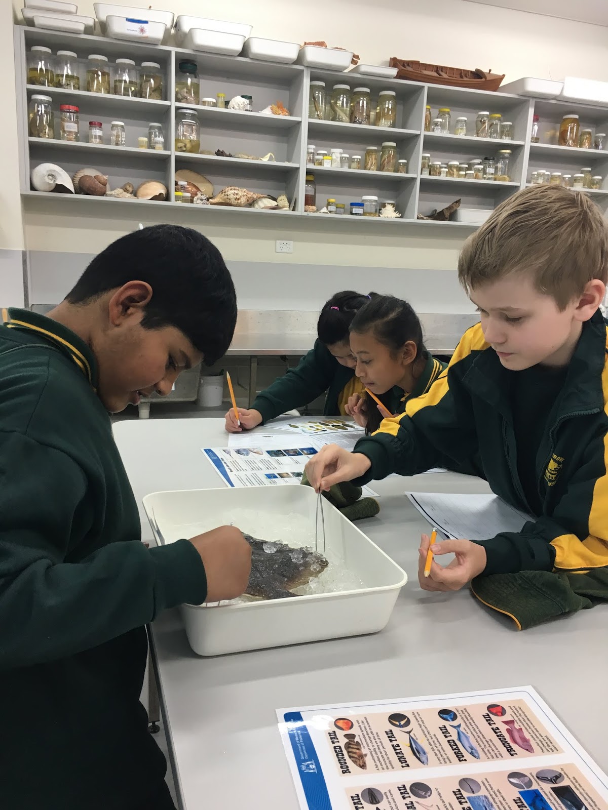 Our first activity involved a session in the Science laboratory. We listened to an interesting presentation about fish, their features and how fish survive in their natural environments. The talk consolidated what we had already covered in the biological sciences unit on animal adaptations. This was followed by a hands-on, small group activity whereby students examined a selection of fresh fish. The fish were smelly and slimy, but students learned a lot from observing and touching the real specimens.